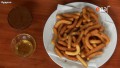 Это испанский вариант нашего любимого хвороста – заварное тесто, обжаренное во фритюре. Простая, но очень вкусная выпечка, а к ней два шикарных дополнения – лаймовый сироп и шоколадная паста.