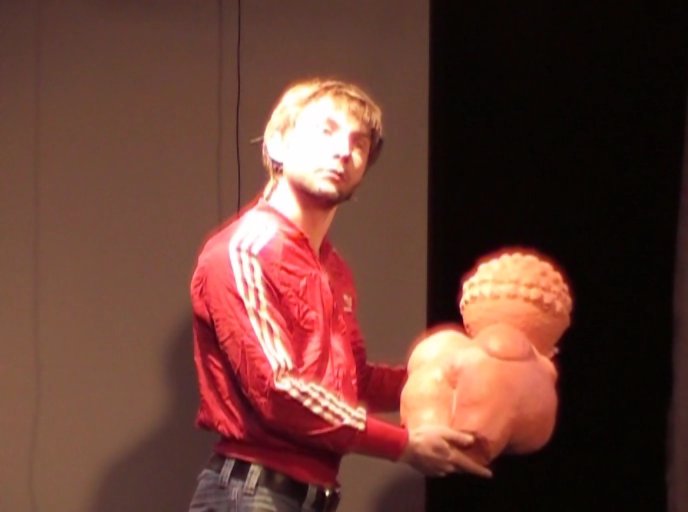 Нашего же "российского дикаря" в лице Михаила Крылова можно наблюдать на сцене театра Школа Современной Пьесы, где небольшое сценическое пространство на ваших глазах будет превращаться то в пещеру с наскальными рисунками, то в современный магазин, гараж, автомобиль, спальню… и всё это только силами актёрского мастерства и вашего воображения. Вообще, спектакль построен скорее, как диалог нежели, как монолог.