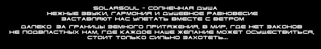 Solarsoul – Солнечная Душа, именно так автор охарактеризовал свое направление в музыкальном творчестве. Hежные звуки, гармония и душевное равновесие заставляют нас улетать вместе с ветром далеко за границы земного притяжения, в мир, где нет законов не подвластных нам, где каждое наше желание может осуществиться, стоит только сильно захотеть…