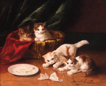 Описание: Альфред-Артур Брюнель де Нёвиль (Alfred-Arthur Brunel De Neuville, 1851 – 1941гг.) — французский живописец, мастер натюрморта, анималист. Родился в Париже. Окончил Парижскую АХ. В 1879 стал членом Объединения французских художников. Основной темой творчества были сентиментальные сценки с домашними животными. Особенной известностью пользовались работы с кошками, играющими котятами и целыми кошачьими семействами. Жил и работал в Париже. Был очень популярен при жизни. Персональные выставки проходили в различных галереях Франции в 1889, 1896, 1908 и 1909. Работы хранятся в музеях Франции и частных коллекциях многих стран.
