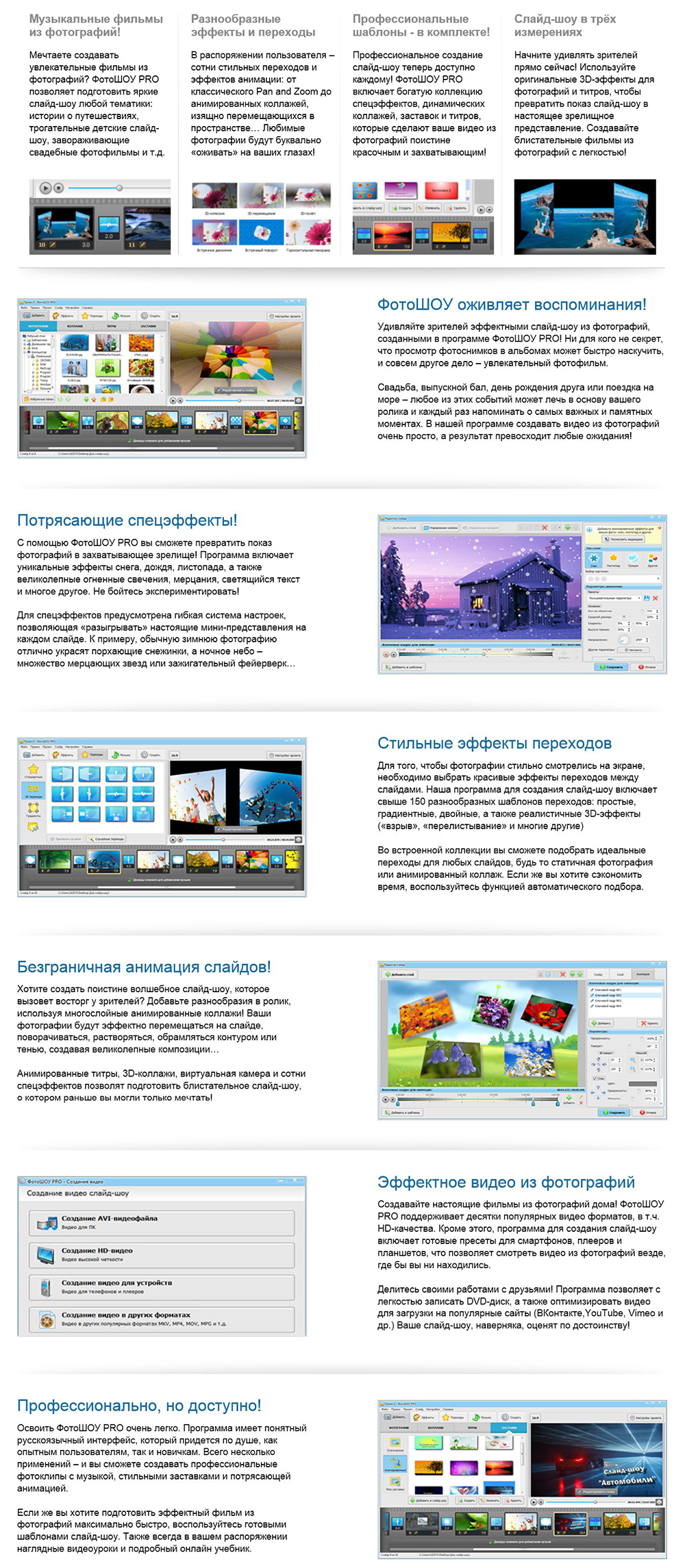 Устали от обычных слайд-шоу из фотографий? ФотоШОУ PRO включает массу 3D-эффектов для фотографий и титров, которые придадут новизну и оригинальность вашему проекту. Удивите ваших зрителей: они наверняка не видели ничего подобного!