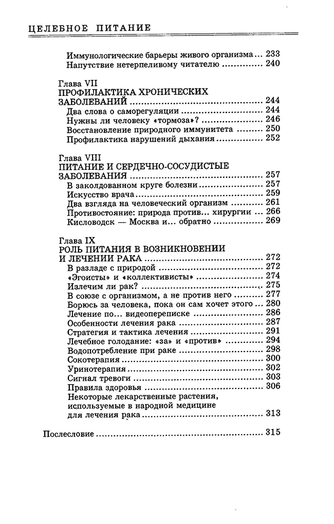 Автор считает, что современные нормы питания в пять раз превышают естественные потребности человека. Использование в пищу мяса и других энергоемких продуктов сокращает продолжительность жизни, дарованной человеку природой. Поэтому важную роль в укреплении здоровья играет целебное питание низкокалорийной, малобелковой пищей, сохраняющей свои биологические свойства.
