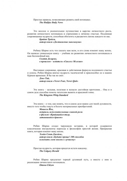 Описание: От автора мегабестселлеров, изданных в 54 странах мира! На страницах этой книги вы снова встретитесь с монахом, который продал свой «феррари». Под его руководством вы вместе с героем книги побываете в Турции, Китае, Японии, Канаде, Испании, Мексике, Индии, Америке, Франции в поисках девяти сакральных талисманов. Вместе с талисманами вы получите девять загадок, девять историй, девять истин, каждая из ко ...