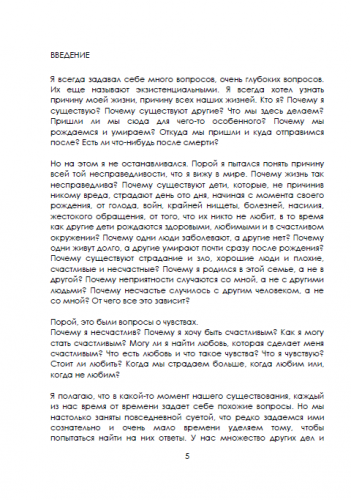 Эта книга поможет вам познать себя, пробудить чувства, освободиться от эгоистической составляющей, понять причину вашего существования и почему с вами происходят те или иные вещи; даст надежду, поможет вам лучше понять других людей и, в конечном счете, полюбить их; понять мир в котором вы живете настолько, что позволит превратить даже самое большое несчастье в нечто полезное для вашей эволюции в любви. В итоге, оно поможет вам стать самим собой — свободным, осознанным человеком, способным испытывать подлинную, безусловную любовь и, следовательно, стать счастливее.