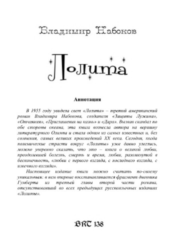 Вызвав скандал по обе стороны океана, эта книга вознесла автора на вершину литературного Олимпа и стала одним из самых известных и, без сомнения, самых великих произведений XX века. Сегодня, когда полемические страсти вокруг «Лолиты» уже давно улеглись, можно уверенно сказать, что это – книга о великой любви, преодолевшей болезнь, смерть и время, любви, разомкнутой в бесконечность, «любви с первого взгляда, с последнего взгляда, с извечного взгляда».