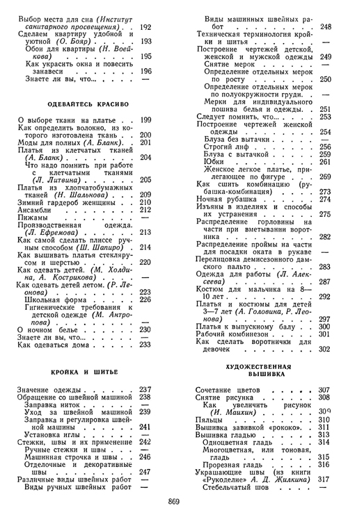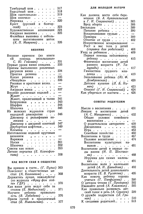 Материалом для составления книги послужили советы, помещаемые в течение многих лет в журналах "Работнiца i сялянка", "Работница", "Крестьянка", "Советская женщина", "Здоровье", "Семья и школа", а также материалы, опубликованные в различных книгах и брошюрах. Список использованной литературы приводится в конце книги.