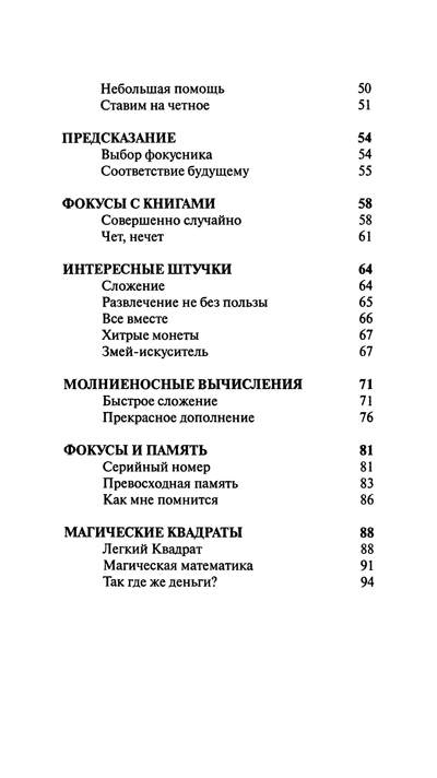 Эта книга позволит вам приобрести «ловкость рук», научит всему, что перечислено выше, и даже больше. В ней вы найдете советы, как подготовить аудиторию к тому или иному фокусу. И, что лучше всего, вы узнаете секреты этих удивительных фокусов. Дерзайте!
