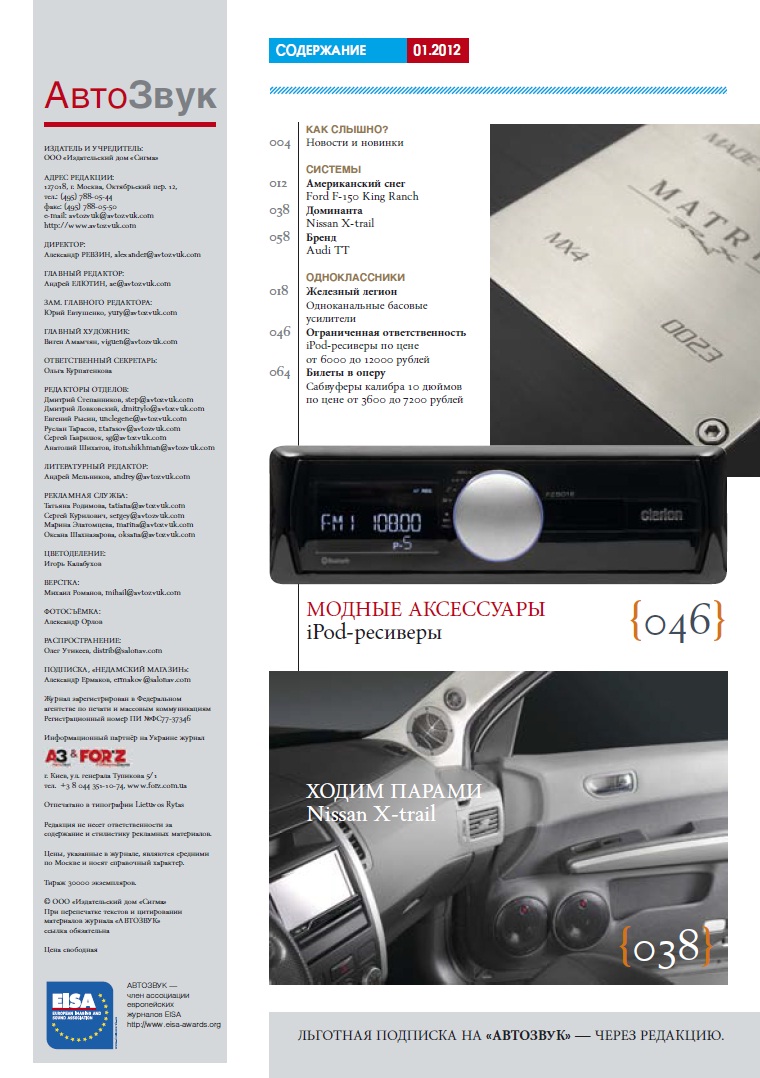 Описание: Издающийся с 1998 г. журнал "АвтоЗвук" - общепризнанно самый компетентный в России журнал по автомобильной электронике. В течение ряда лет представляя нашу страну в международной ассоциации European Car Audio Press (ECAP), с 2002 года "АвтоЗвук" на правах эксклюзивного представителя России вошёл в отделение "Мобильная Электроника" самой престижной в мире ассоциации специализированной прессы EISA (European Image and Sound Association). Журнал проводит тестирование техники на базе собственной лаборатории силами авторитетных экспертов. Благодаря этому, как подтверждают данные многочисленных опросов, журнал пользуется непререкаемым авторитетом как источник объективной информации о мобильной аудиотехнике не только в кругах любителей, но и среди импортёров аудиотехники и профессионалов-установщиков.