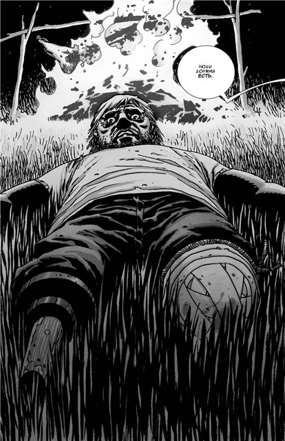 Но чувства, которые вызывает комикс - нечто большее. Тут есть ведь и просто межчеловеческие отношения - кто-то не может примириться с потерей близких, кто-то нашел себе врага среди живых, кто-то уповает на Бога, кто-то замкнулся в ненависти ко всем. Доверять ли незнакомцу только потому, что он не зомби? Он может и оказаться преданным товарищем, и воткнуть нож тебе в спину - только из желания выжить; а недостаток доверия может обернуться кровопролитием, которое унесет больше жизней, чем любые ходячие мертвецы.