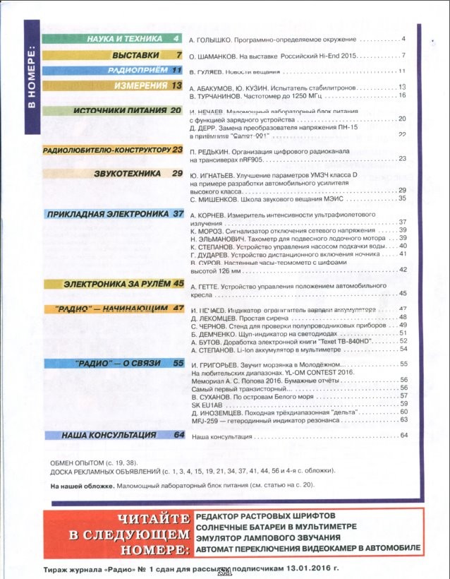 Описание: "Радио" - ежемесячный научно-технический журнал для радиолюбителей. Издается с 1924 года. Основные направления публикаций: аудио-видео техника; бытовая электроника; компьютеры; телекоммуникации. Основные тематические разделы журнала: Электротехника Радиоприём Измерения Компьютеры Микропроцессорная техника Источники питания Радиолюбителю-конструктору Прикладная электроника Электроника за рулём Справочный ...